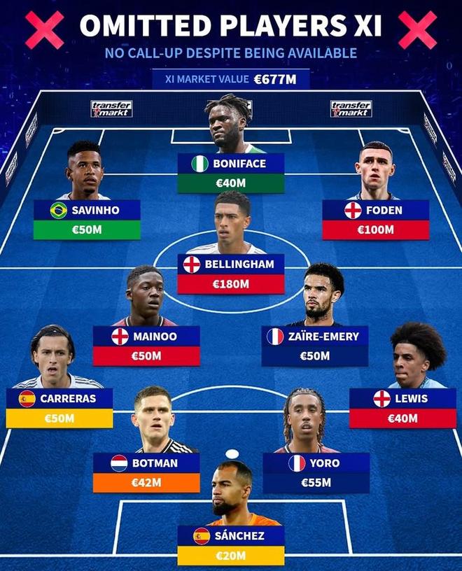 德轉(zhuǎn)列此次非傷病原因落選國(guó)家隊(duì)的最貴11人陣容: